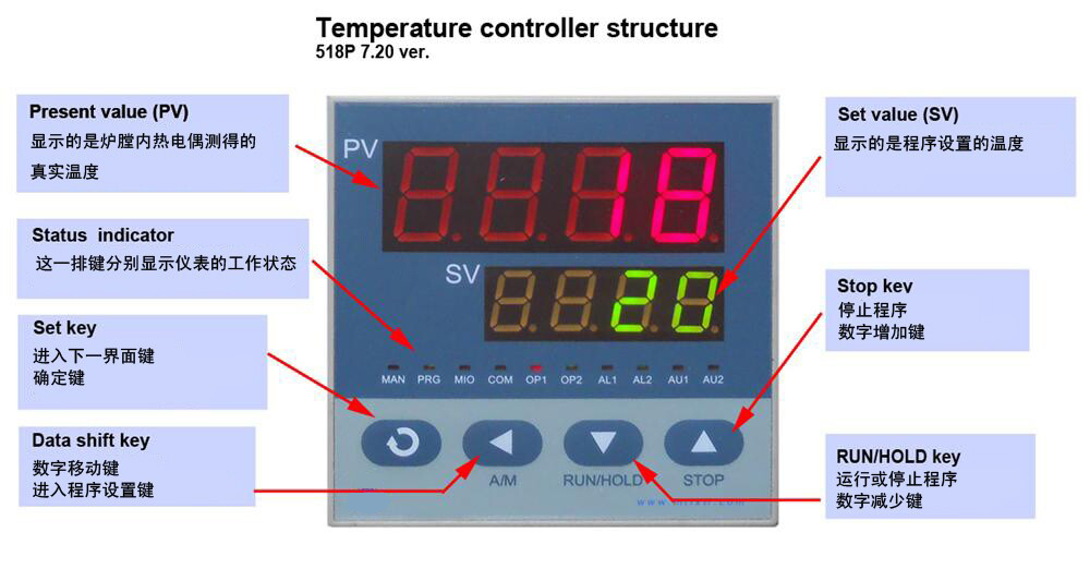 采用宇电程序控温仪表(标配) 1、30段程序控温智能PID调节。 2、具有过温保护 断偶保护过温或断偶时电炉加热电路自动切断,,(当电炉温度超过1200度或热电偶烧断时,主电路上的交流继电器会自动断开,主电路断开,面板上ON灯熄灭,OFF灯亮,有限的保护电炉)。 3、带有485 通讯接口(选购软件时标配) 4、具有断电保护功能,即断电后再给电启动炉子时、程序不是从起始温度开始升、而是从断电时炉温开始升。 5、仪表具有温度自整定的功能 (更换进口仪表,需要另外付费,选购) |